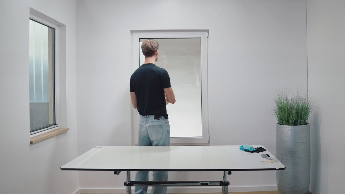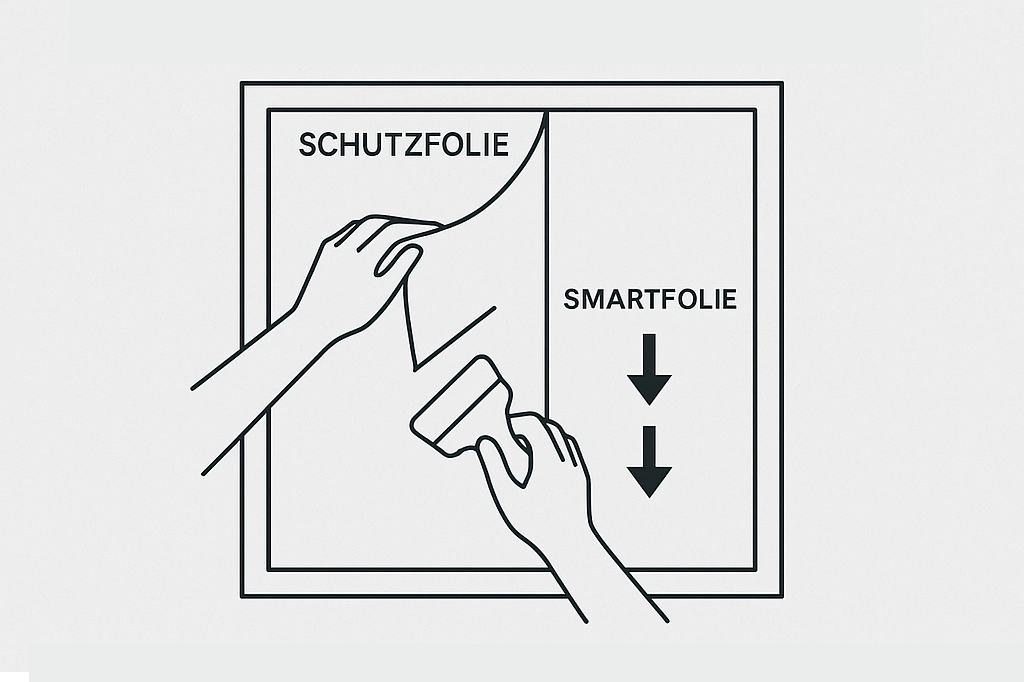 Setz die Folie oben am Fenster ganz genau an. Dann ziehst du die Schutzfolie langsam ab und drückst die Smartfolie Schritt für Schritt nach unten an. Mit dem beiliegenden Rakel arbeitest du dich dabei gleichmäßig nach unten – so bleibt alles glatt und blasenfrei.