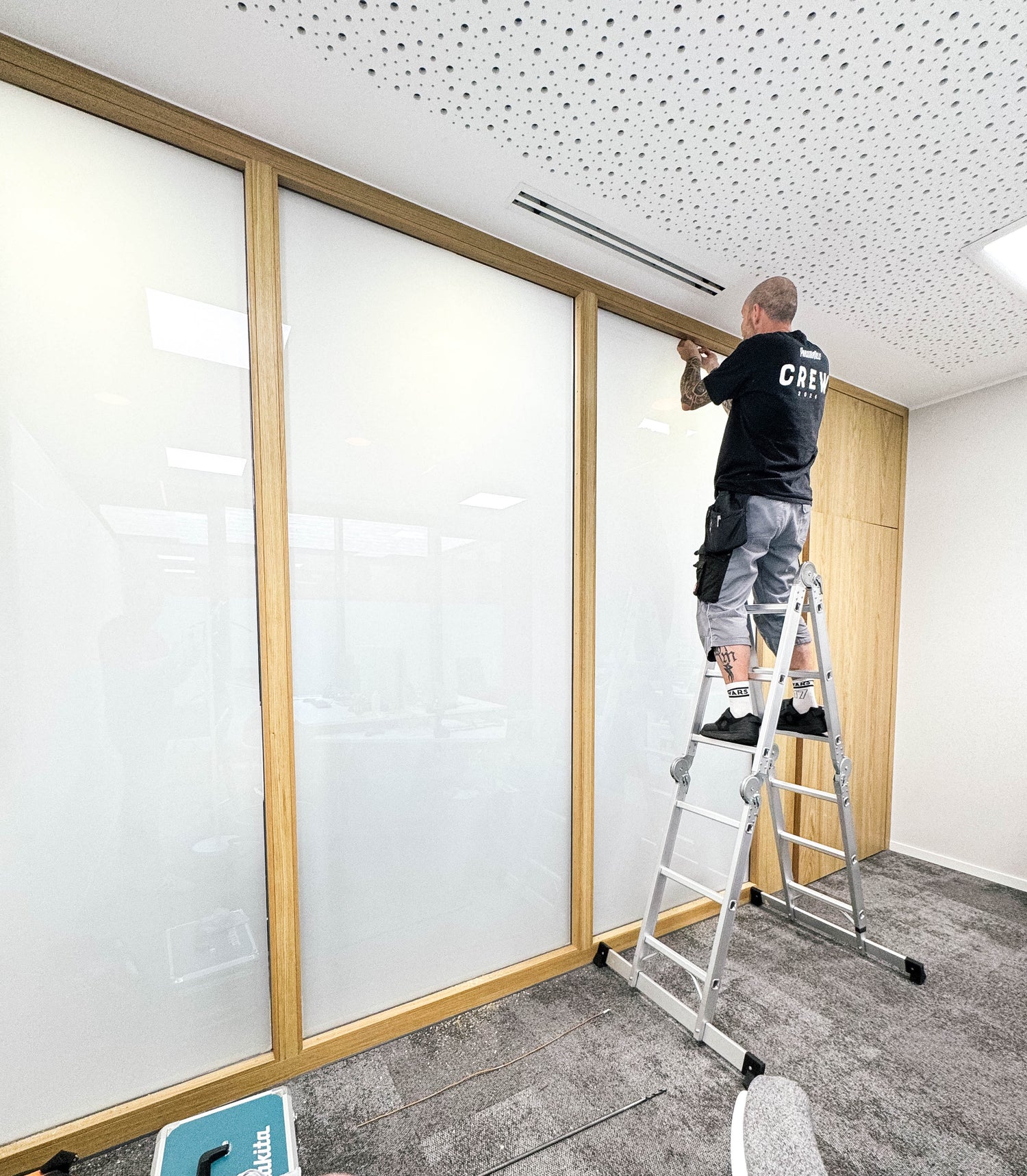 Schaltbare Milchglasfolie macht Büros flexibel: Offenheit oder Privatsphäre nach Bedarf, automatische Blickdichte am Abend und ein moderner Auftritt ohne Gardinen – in einem 1000 m² Bürogebäude eindrucksvoll umgesetzt.